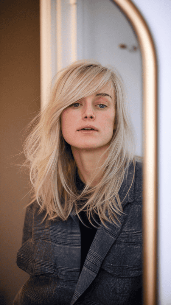 Use a round brush while blow-drying to get some volume and feathered layers. This look works well with tousled or slightly messy hair and frames your face in a really flattering way.