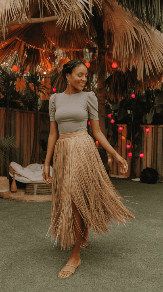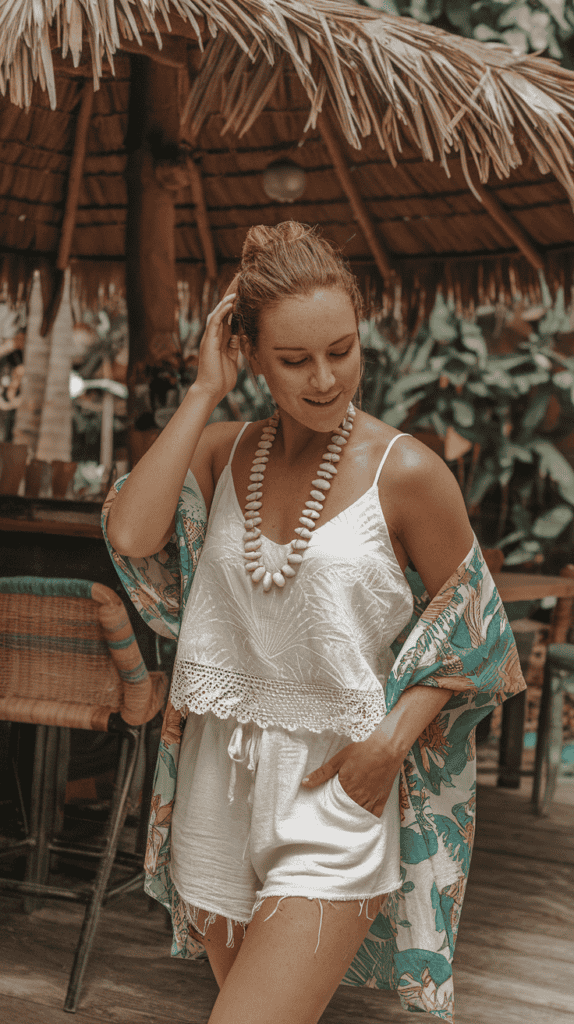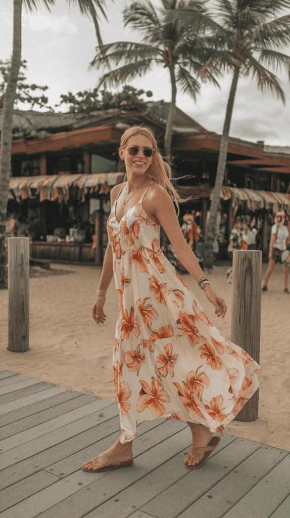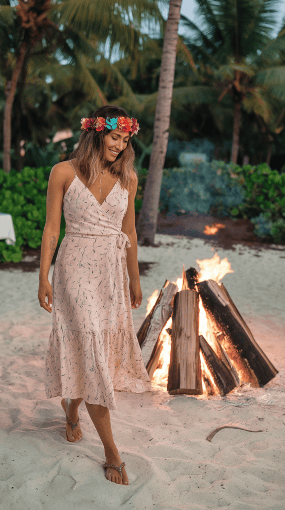 Layer necklaces or wear a flower headscarf to add to the vibe. Comfy sandals or flip-flops keep things casual and island-ready.