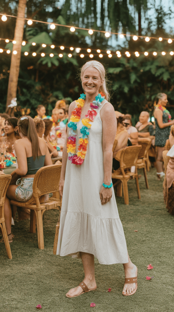 Honestly, a flowy maxi dress with hibiscus patterns is always a win. It’s light, breezy, and keeps you cool at any Hawaiian party.