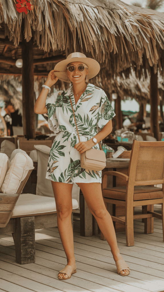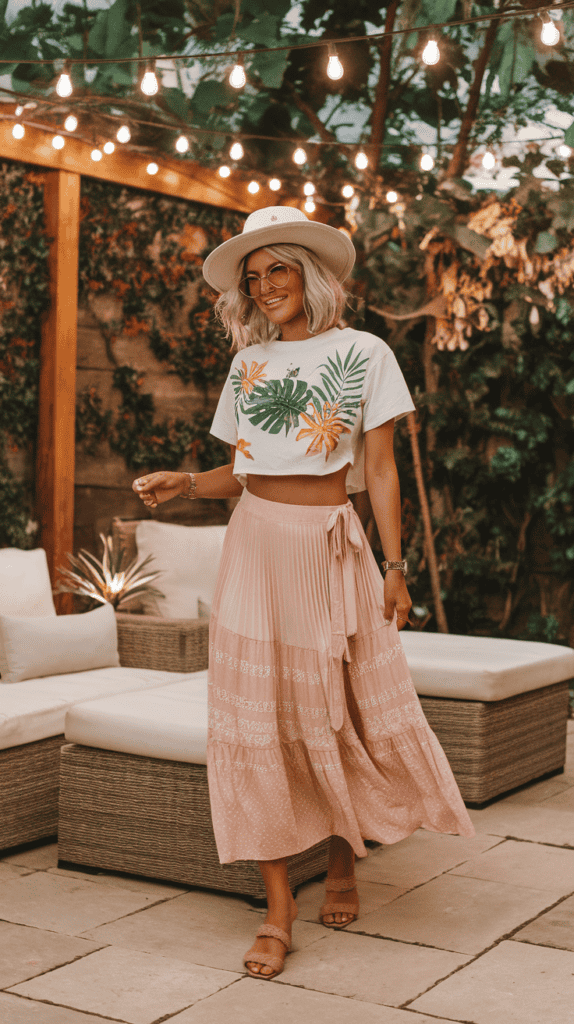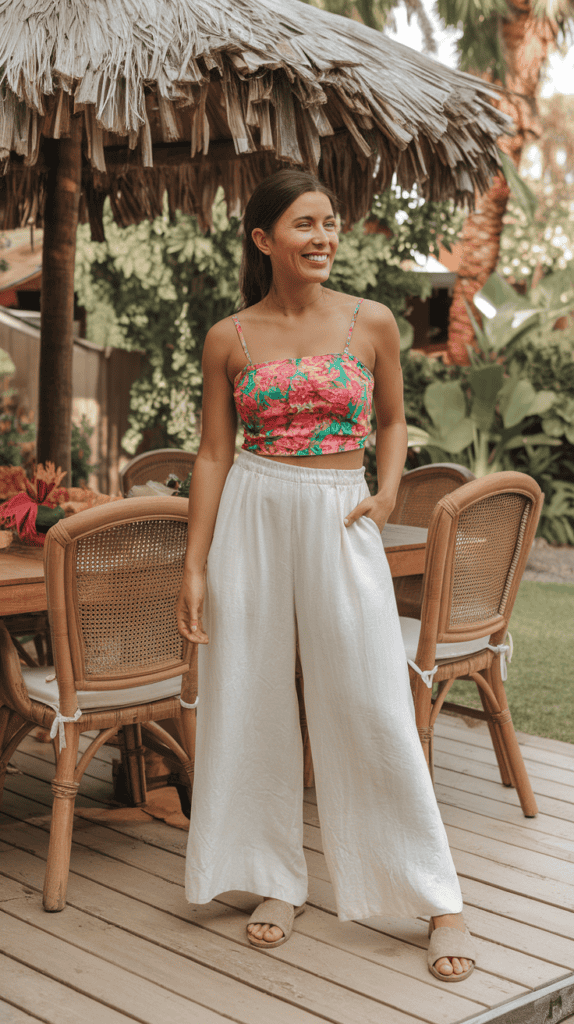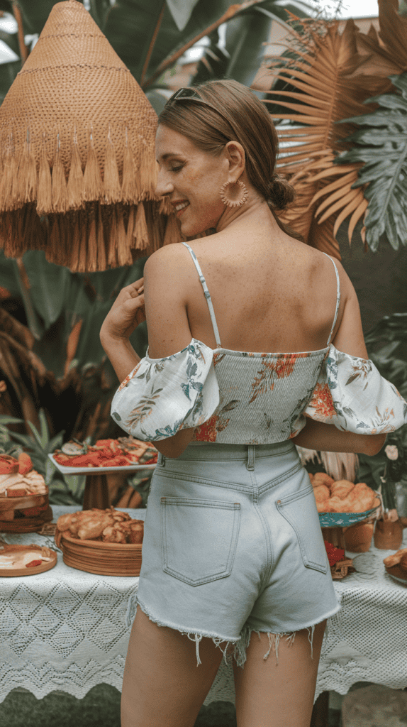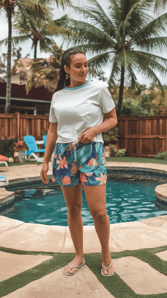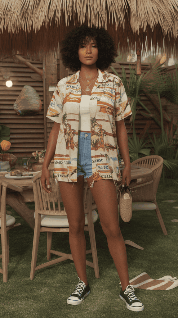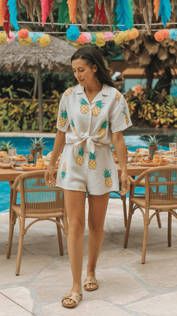 Pick one with palm leaves or pineapples for that tropical touch. Pair with high-waisted shorts or a skirt for an easy, put-together look that lets you enjoy the party without any fuss.