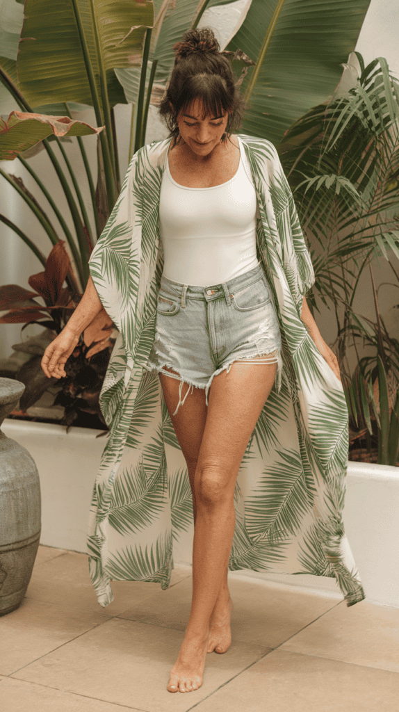 A palm leaf print kimono adds a fresh, tropical touch to your outfit. It’s light and breezy, so you’ll stay cool at the party.