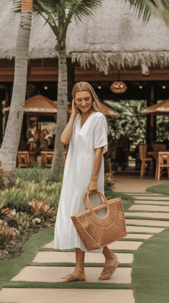 I love a rattan beach tote for carrying your stuff in style. The natural, laid-back look fits the island vibe perfectly.