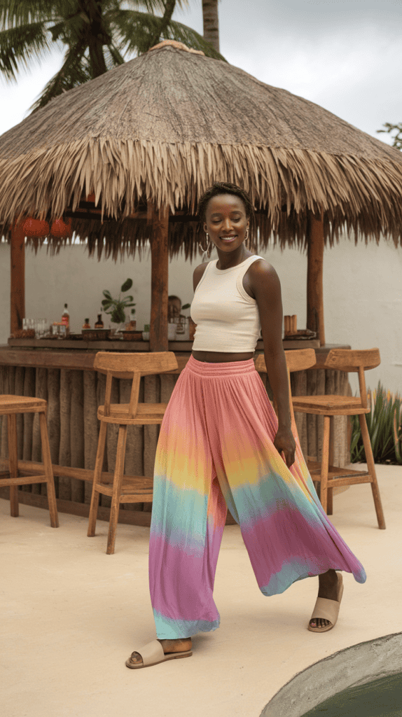 Palazzo pants in sunset colors? Yes, please. Warm shades like orange, pink, and soft yellow look just like a beach sunset.