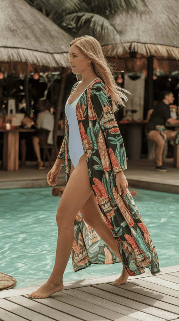 A long beach cover-up with tiki patterns is such an easy win. Slip it over your swimsuit and you’ve got instant island vibes.