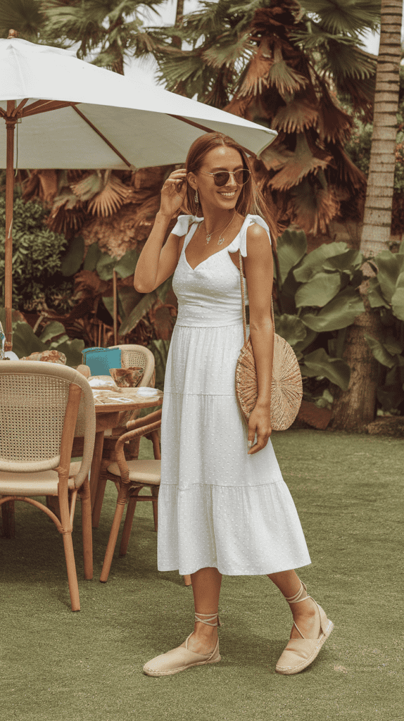 Strappy sandals with beaded details add sparkle and a bit of tropical charm. They’re not too flashy, just the right amount of fun.