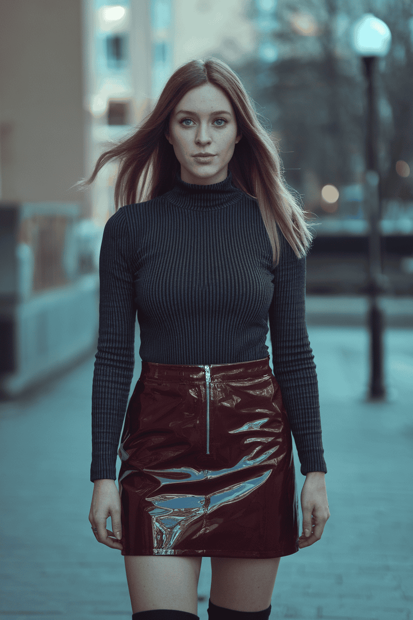 Make a fitted turtleneck look cool by pairing it with a shiny vinyl skirt. The skirt brings in shine and a little attitude—just what a night out needs.