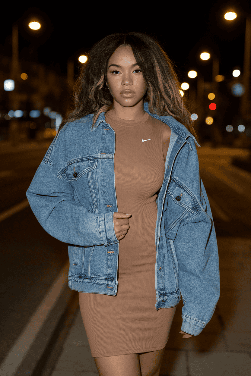 Throw a denim jacket over your bodycon dress for a cool, easygoing vibe. The jacket tones down the dress, so you feel comfy but still look great.
