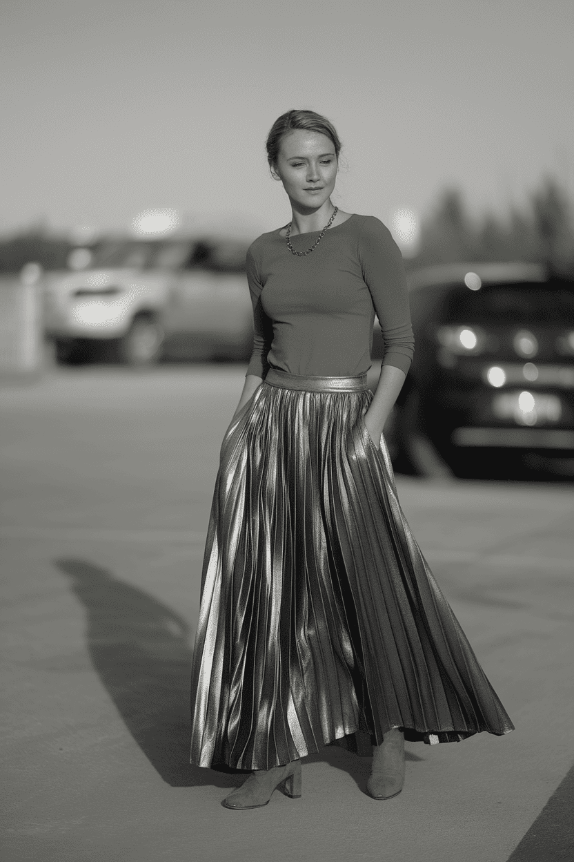 Pair a metallic pleated skirt with a fitted top to really let that skirt pop. This keeps the look balanced and sleek, not overdone.