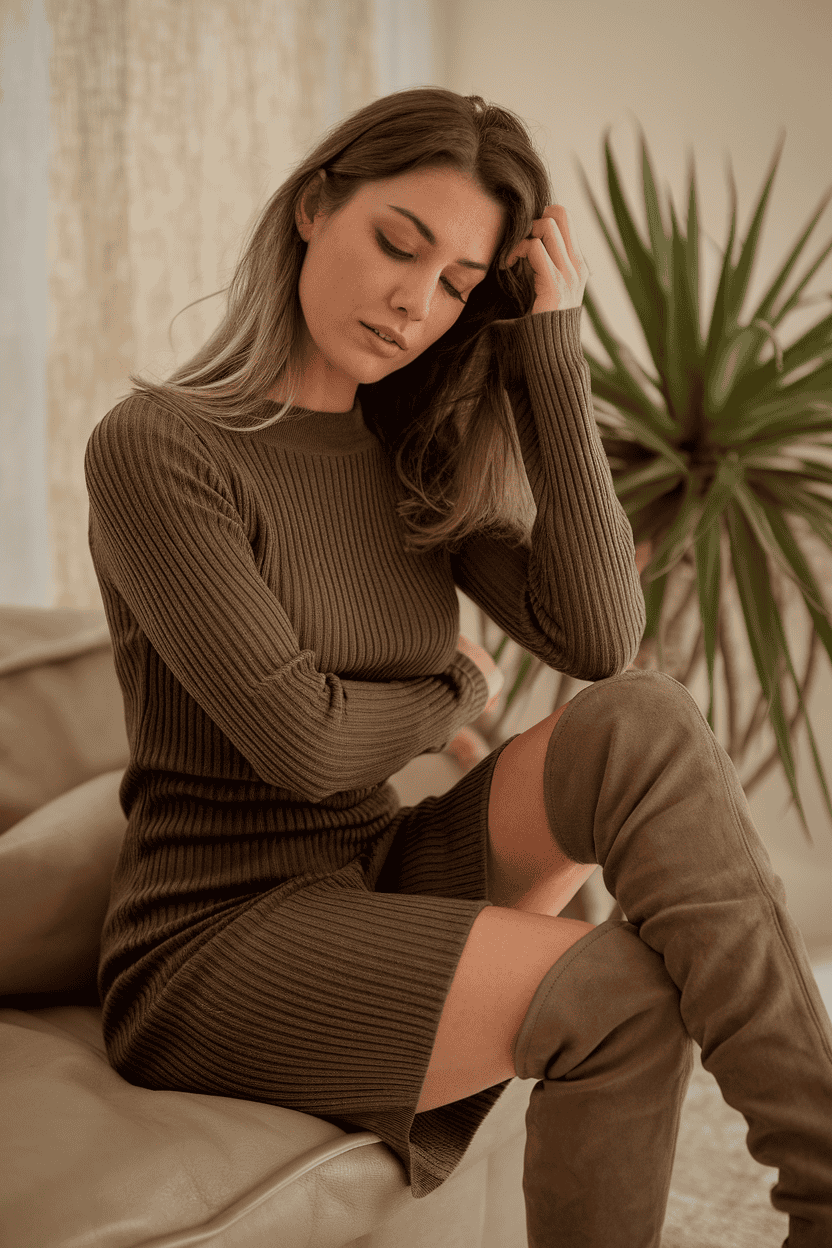 Ribbed knit dress with thigh-high boots