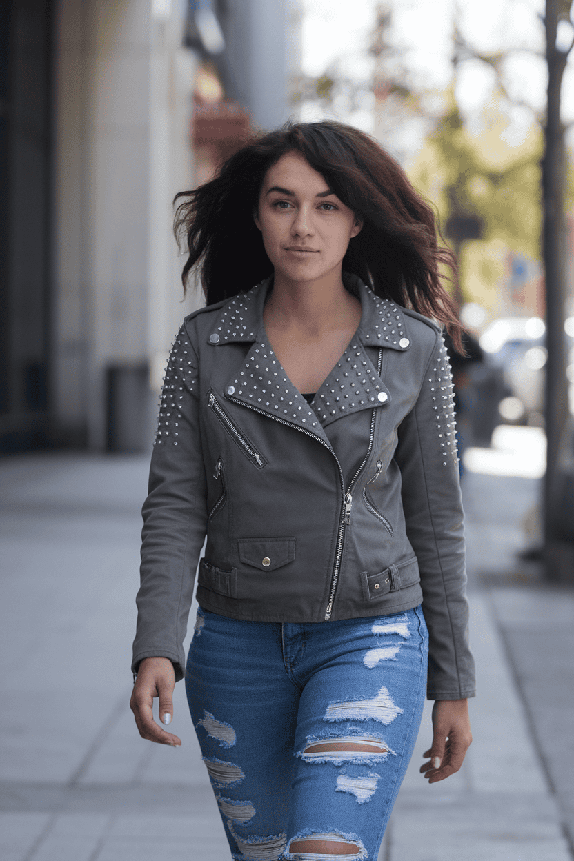 Studded moto jacket with ripped skinnies