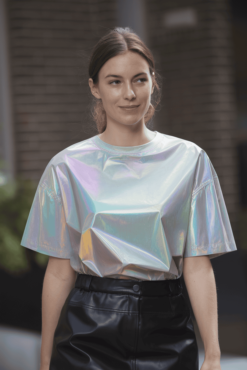 A shiny holographic top and a black leather skirt make a killer combo for a night out. The skirt’s got that cool edge, and the top brings the fun.
