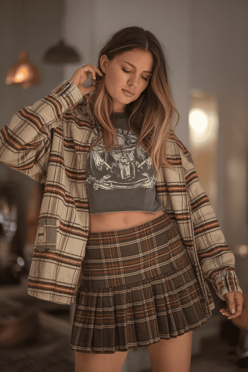 Plaid mini skirt with a graphic crop top