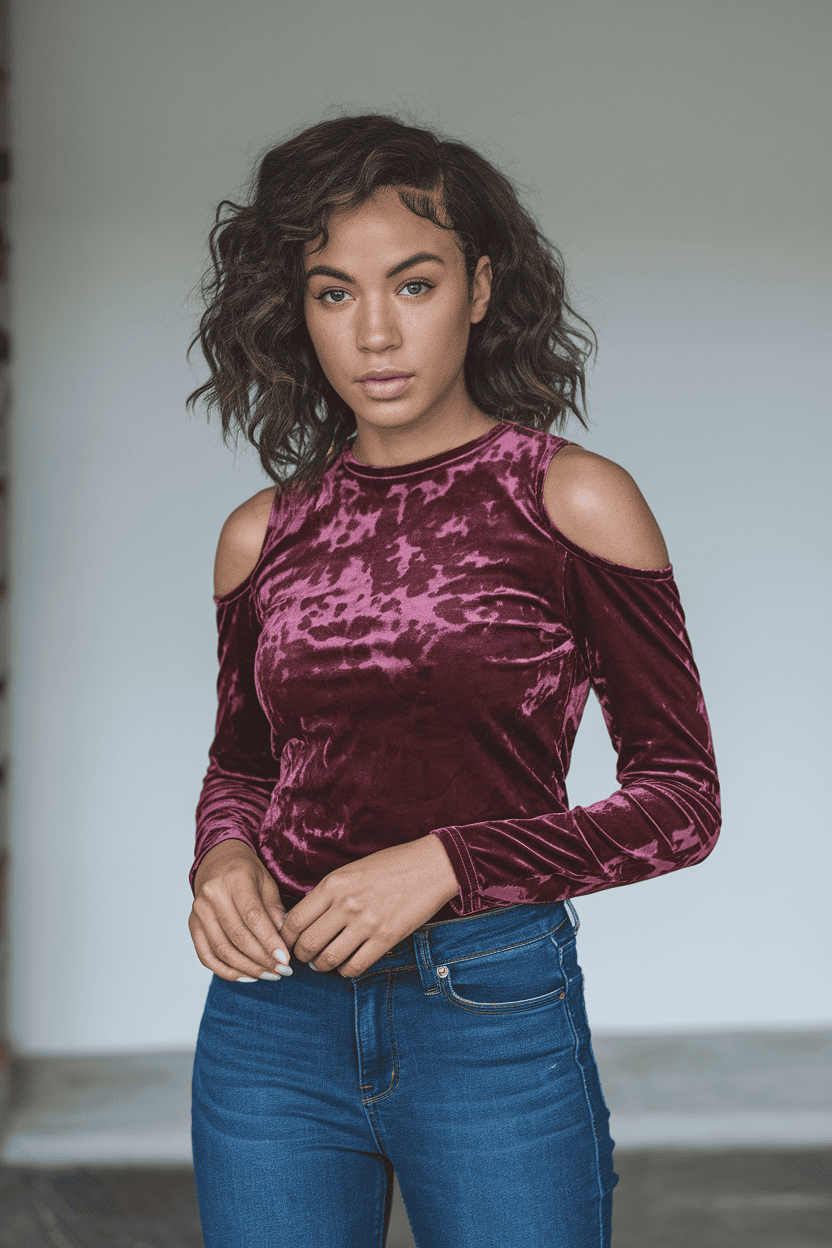 Cold shoulder velvet top with slim jeans