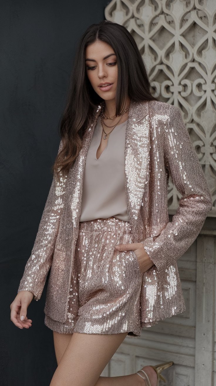 Sequin blazer and matching shorts—talk about catching the light. It’s just the right amount of sparkle, not overboard.