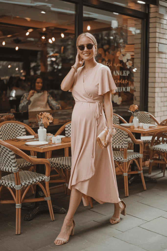 You can easily dress it up with simple jewelry or keep it casual with flats. The wrap style highlights your bump gently while giving you room to move.