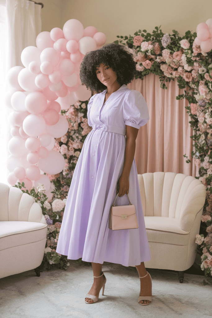 A floral midi dress in soft pastel tones is an easy way to look fresh and stylish. These colors are light and calming, perfect for a baby shower vibe.