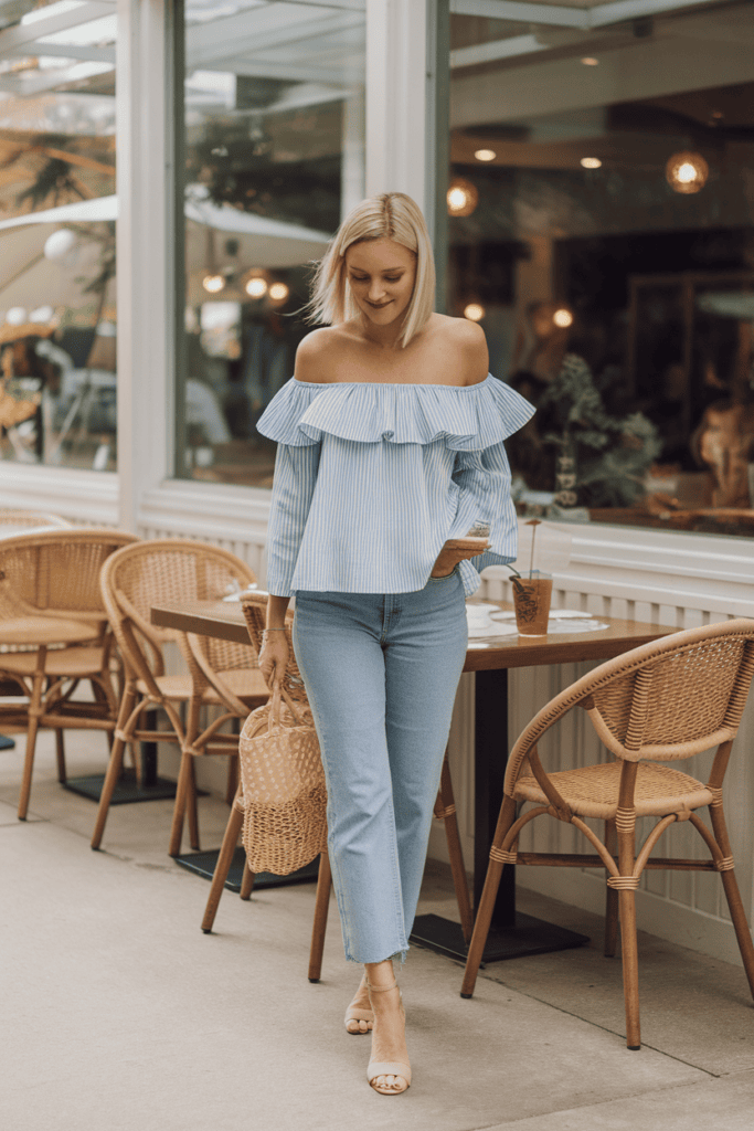 Ruffled off-the-shoulder top with jeans