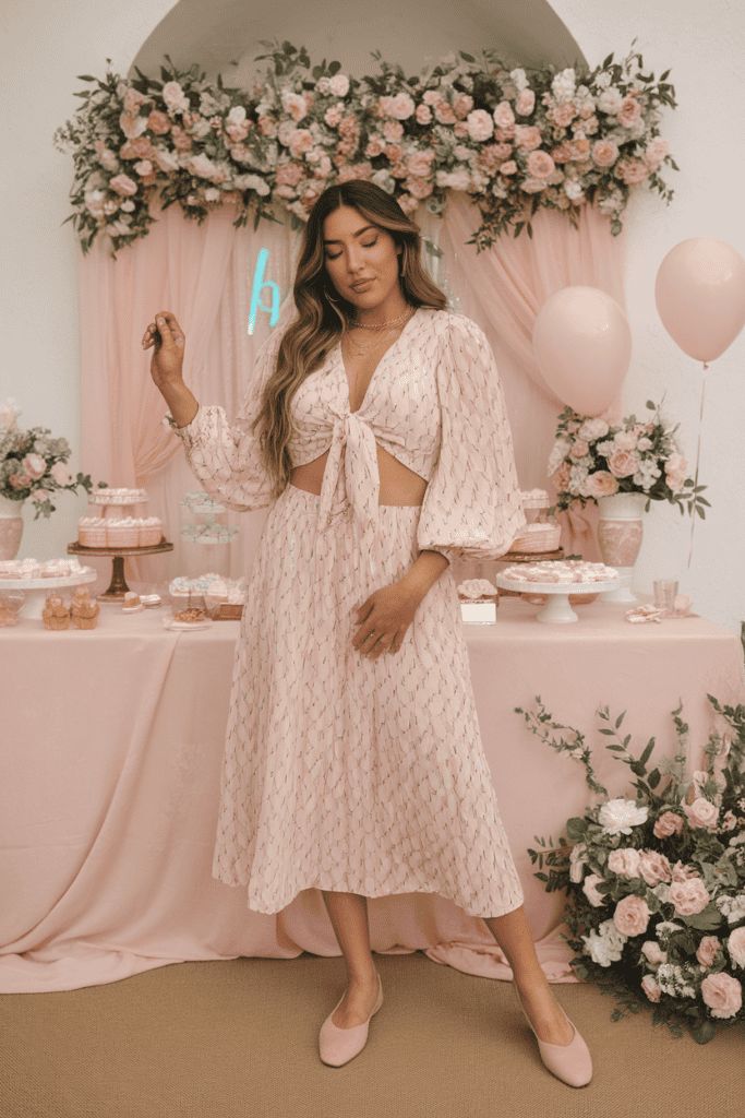 You can’t go wrong with a tie-front blouse and a skirt for a baby shower. This combo feels fresh and cute without trying too hard.