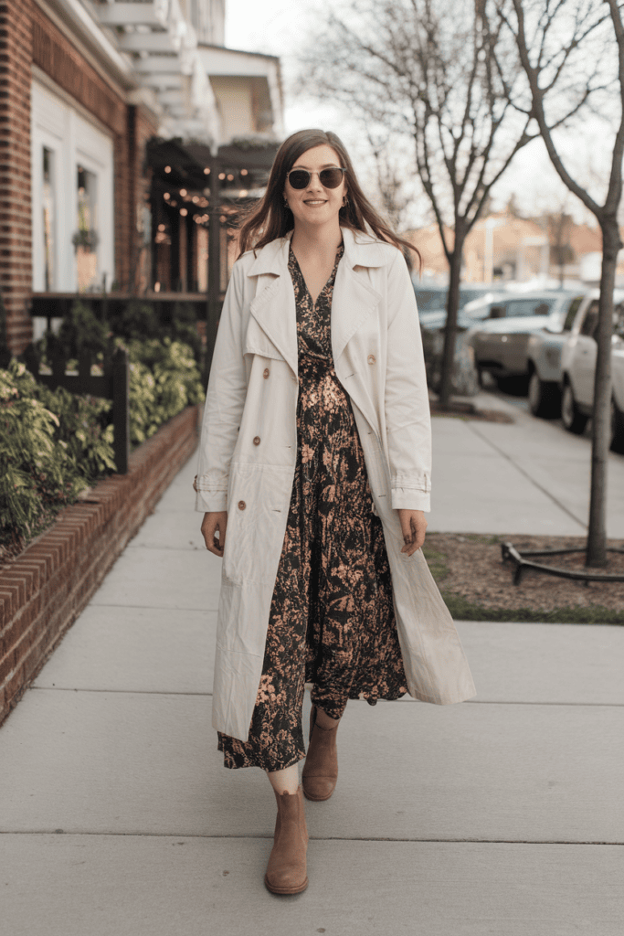 Pick a neutral trench to keep things classic. It works well with floral or solid-colored dresses alike.