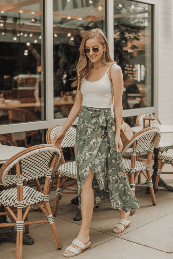 Green floral wrap skirt with tank top