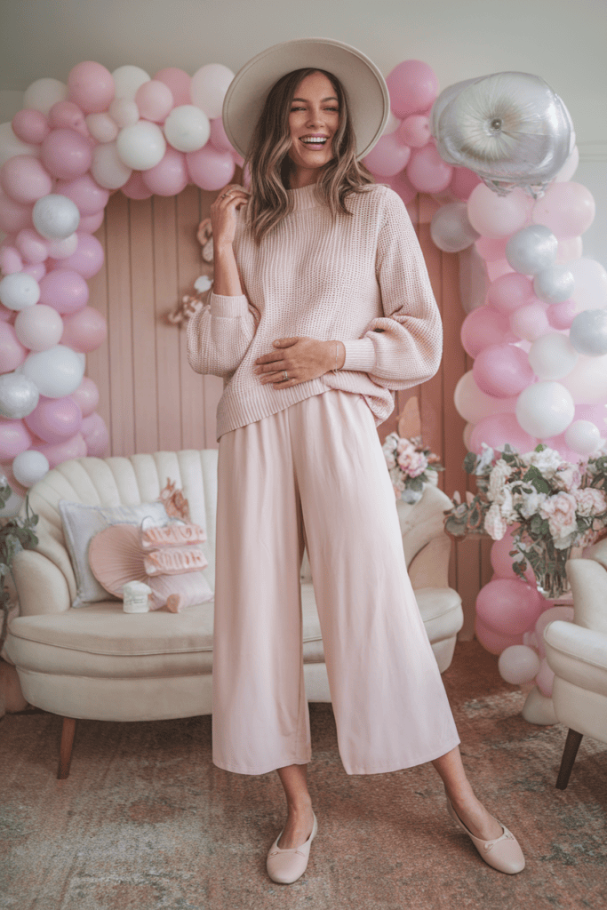 This combo feels cozy but still looks polished, perfect for a baby shower. You can finish your outfit with simple flats or low heels to keep things comfortable and stylish.