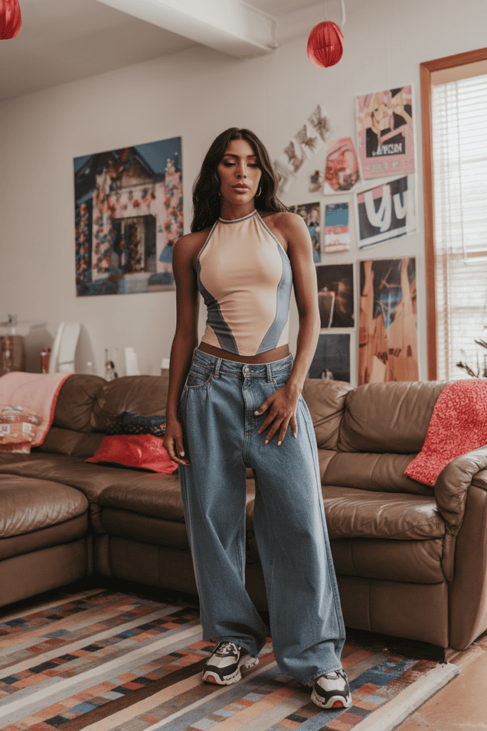 Try pairing baggy jeans with a halter top for a classic 90s look. The loose jeans keep things comfy, while the halter adds a flirty, fun touch.