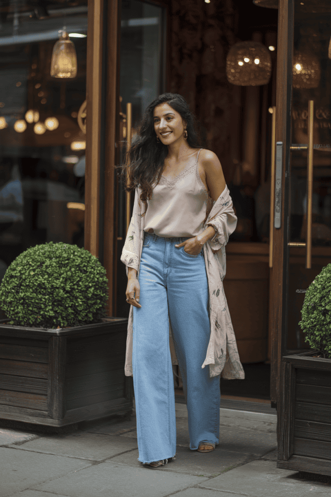 Layering with wide jeans works best with pieces that don’t pile on bulk. Lightweight cardigans, cropped jackets, or short blazers all sit nicely above the hips and keep your shape in check.