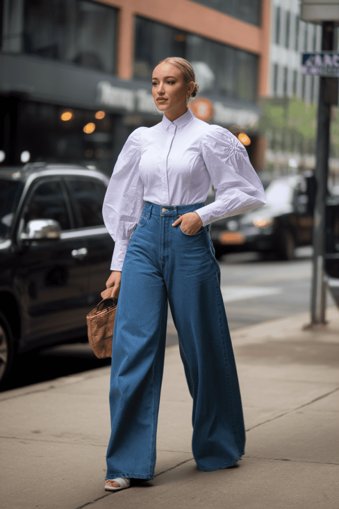 Elevate your wide jeans with a structured blouse featuring puff sleeves. The volume up top adds some drama, but the structure keeps it looking sharp.