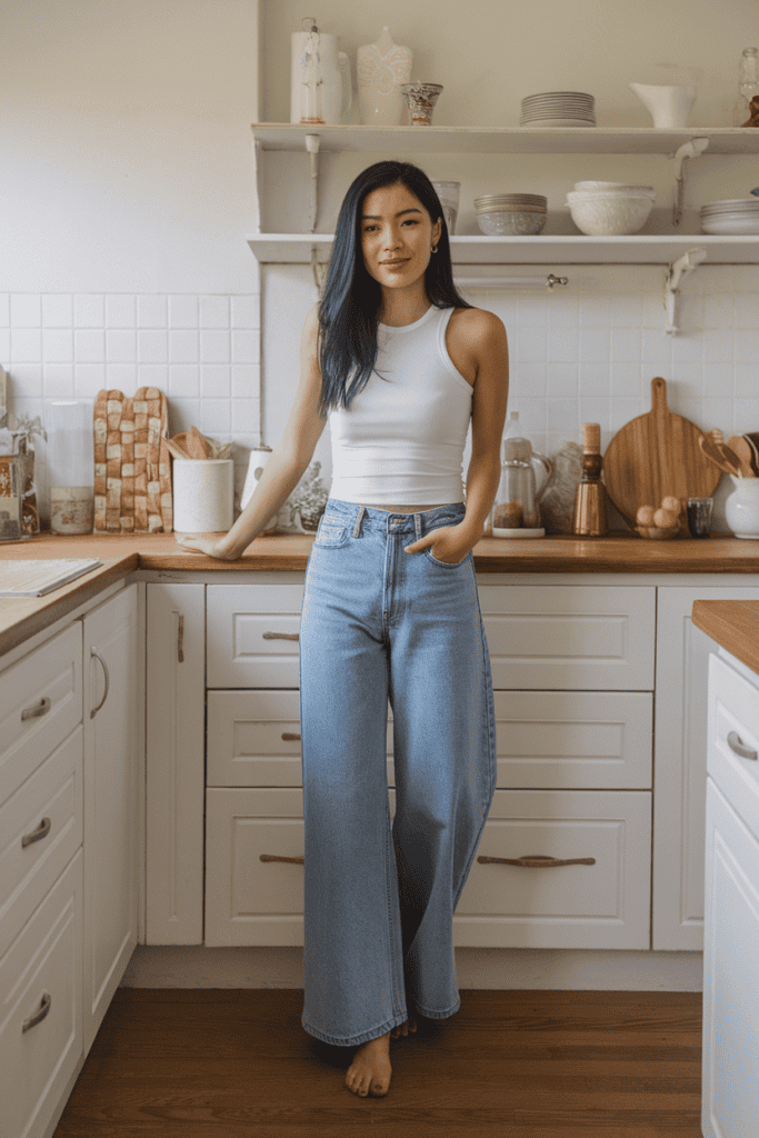 A ribbed tank top is a solid pick with wide jeans. It’s lightweight and hugs your body, which balances out all that denim.