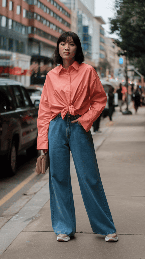 Rock wide-leg jeans with a bright oversized shirt tucked in at the front for a pop of color