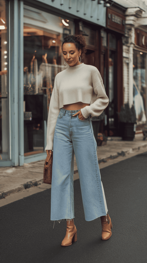 Wide-leg jeans and a cropped sweater just work together. The shorter top makes your waist stand out and fits perfectly with high-rise jeans.