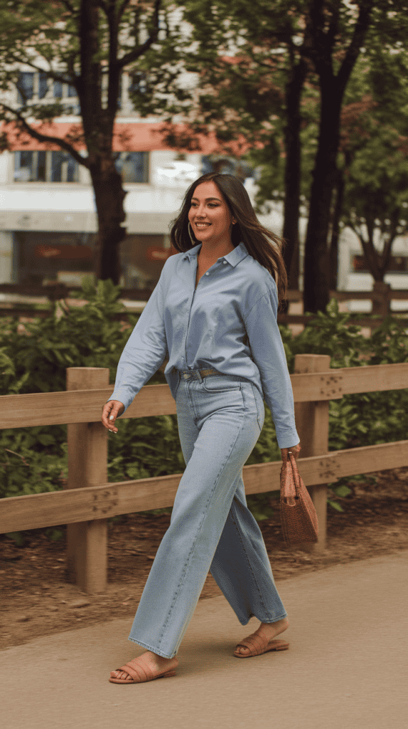 A loose button-down shirt with wide-leg jeans? Can’t really go wrong there. The relaxed fit feels comfortable but still looks intentional.