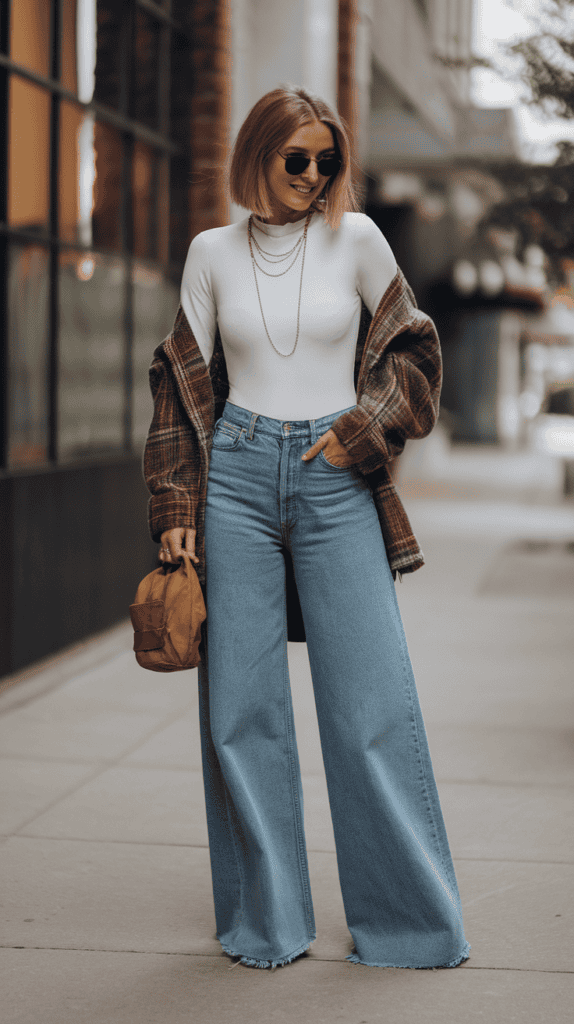 You can style wide-leg jeans all year if you layer right. In spring and fall, lightweight jackets like cropped blazers or denim jackets keep things crisp but cozy.