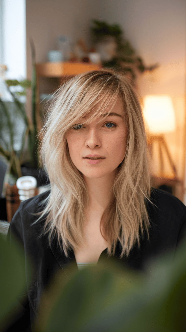 If you like something soft but still want a bit of edge, try a blonde wolf cut with side-swept bangs. The bangs gently frame your face and add movement to the style.