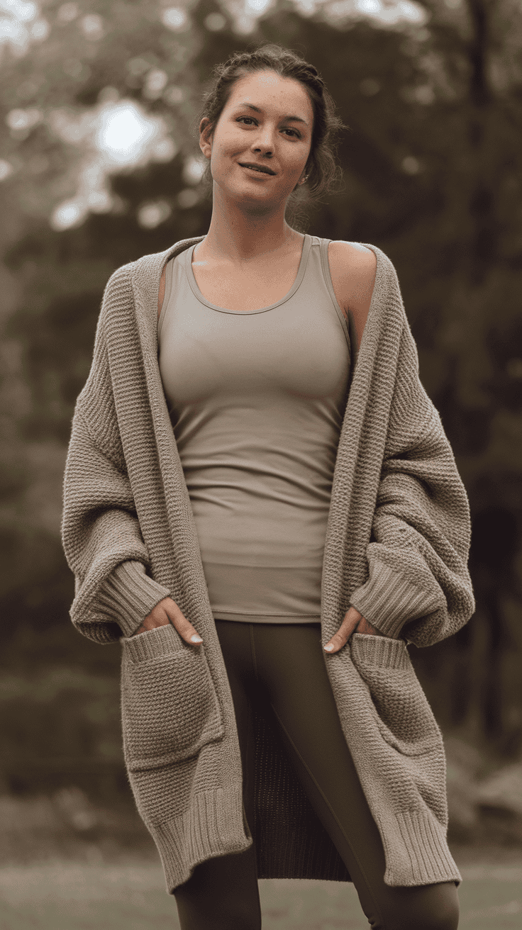 Soft, oversized cardigan over a simple tank and leggings