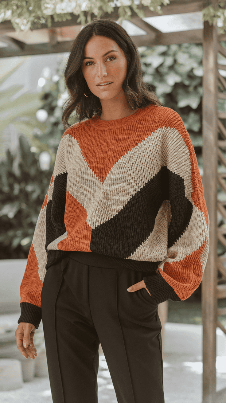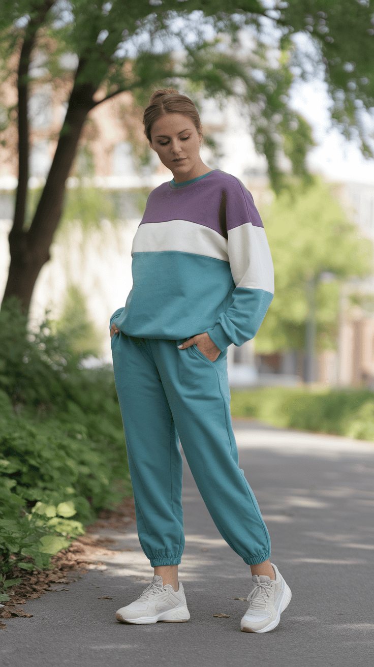 Wear a color-blocked pullover with tailored joggers for a stylish, comfy vibe. The pullover brings some color without going over the top.