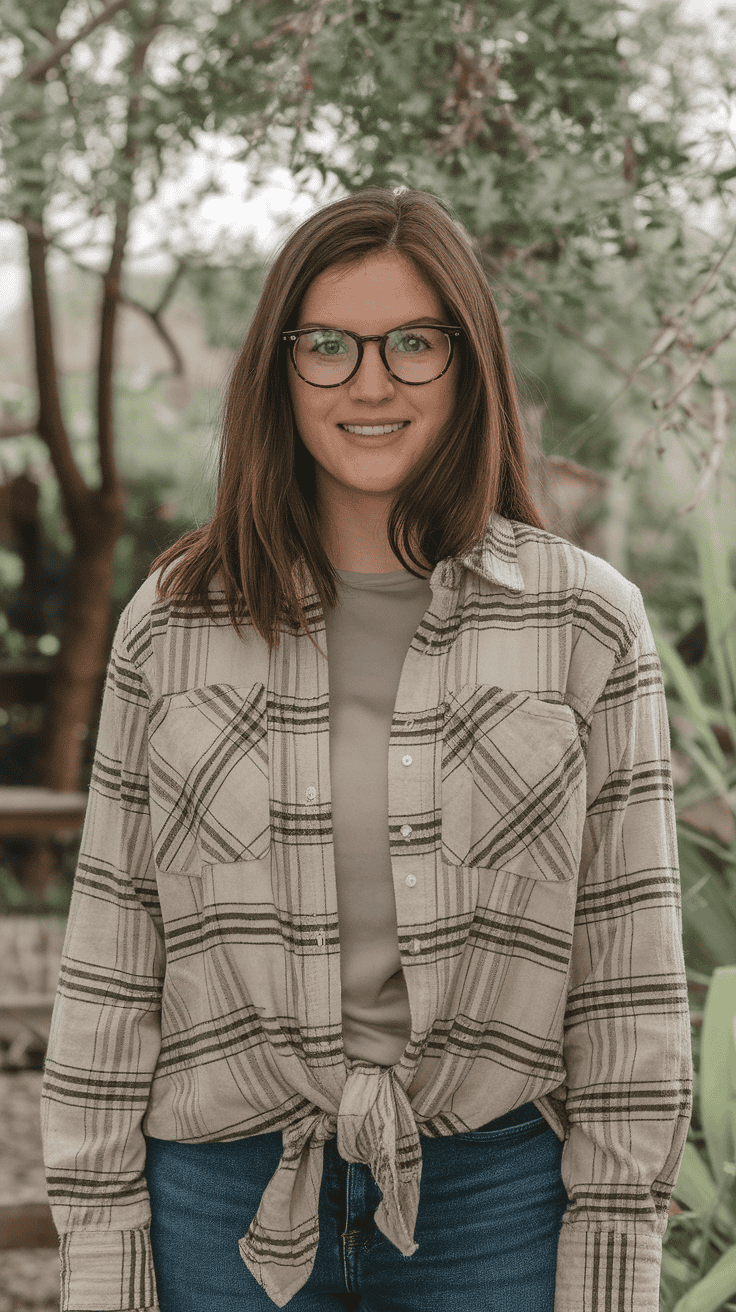 Plaid button-up shirt tied at the waist over a plain tee