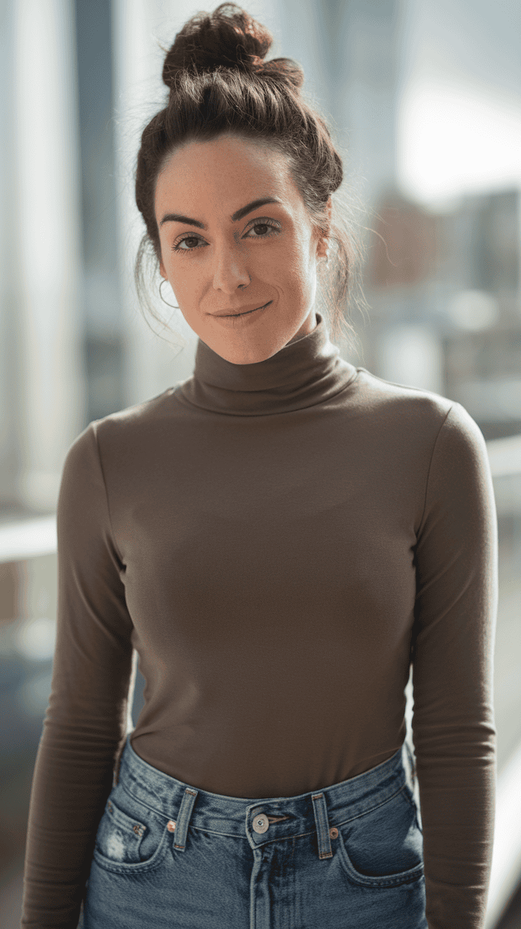 A solid turtleneck tucked into mom jeans? Always a win. It’s simple, comfortable, and you’ll look put together with zero stress.