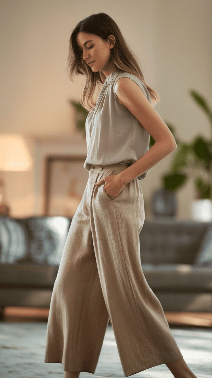 Pair a sleeveless blouse with wide-leg cropped pants for a light, breezy feel. This combo looks polished but doesn’t take much effort.