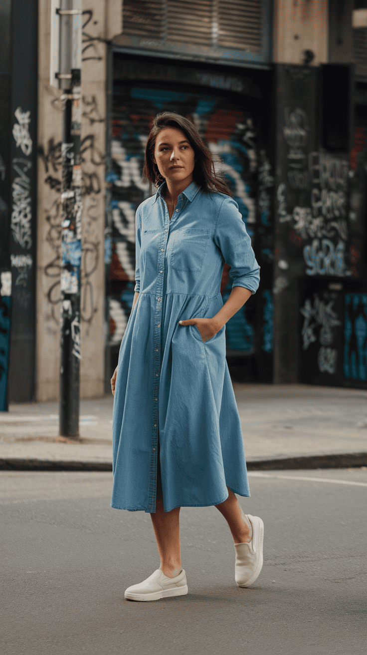 Button-down chambray dress with white slip-on sneakers