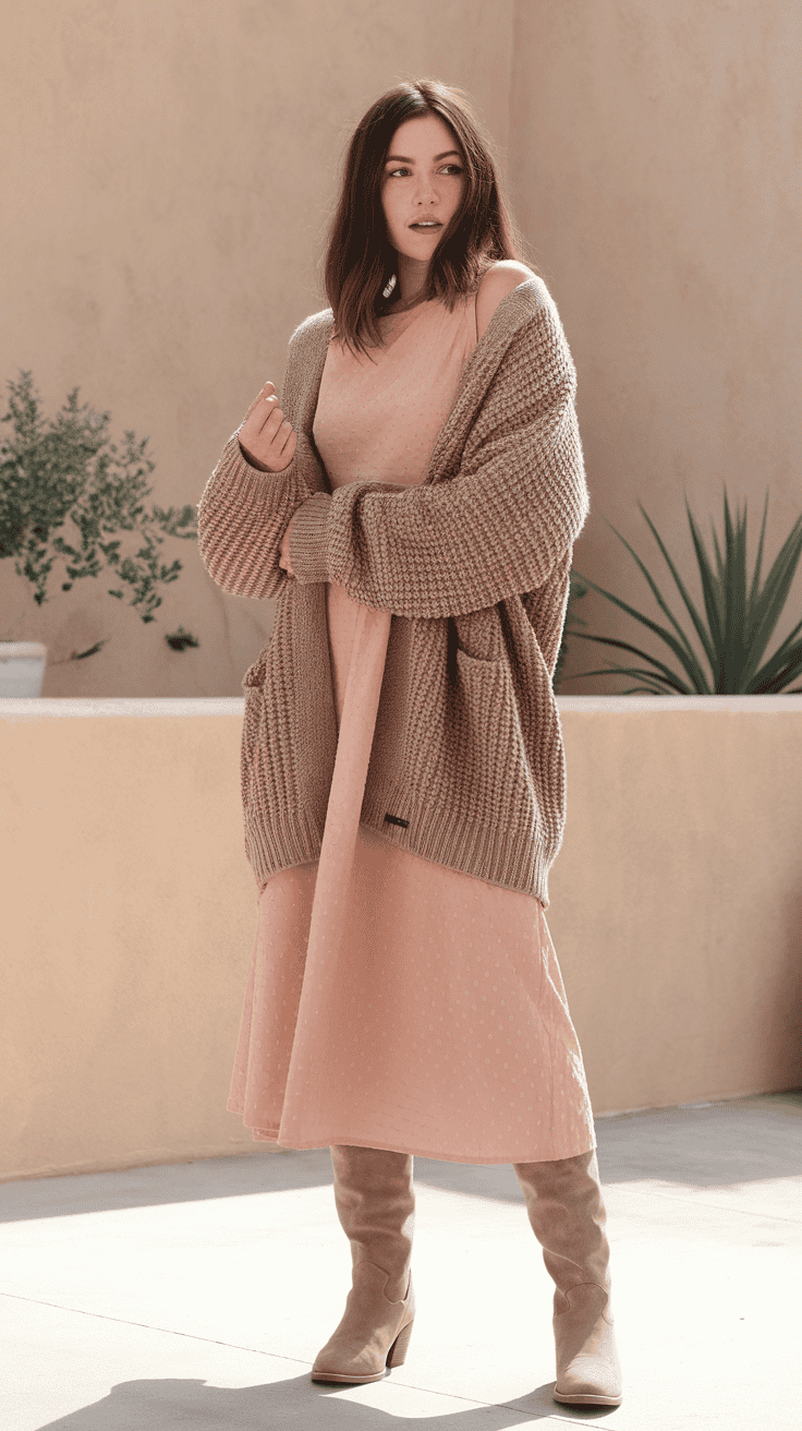 Throw a chunky knit cardigan over your pastel midi dress for extra coziness. It keeps you warm but still lets the dress shine.