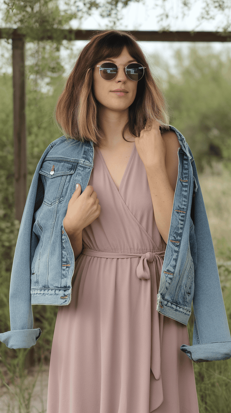 Wrap-style midi dress with a casual denim jacket