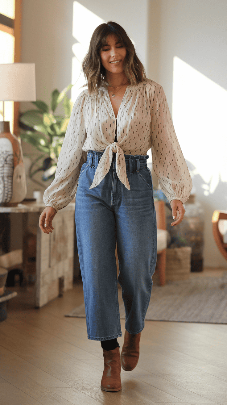 Tie-front blouse paired with paper bag waist jeans