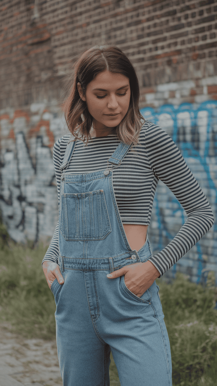 Striped crop top paired with relaxed denim overalls