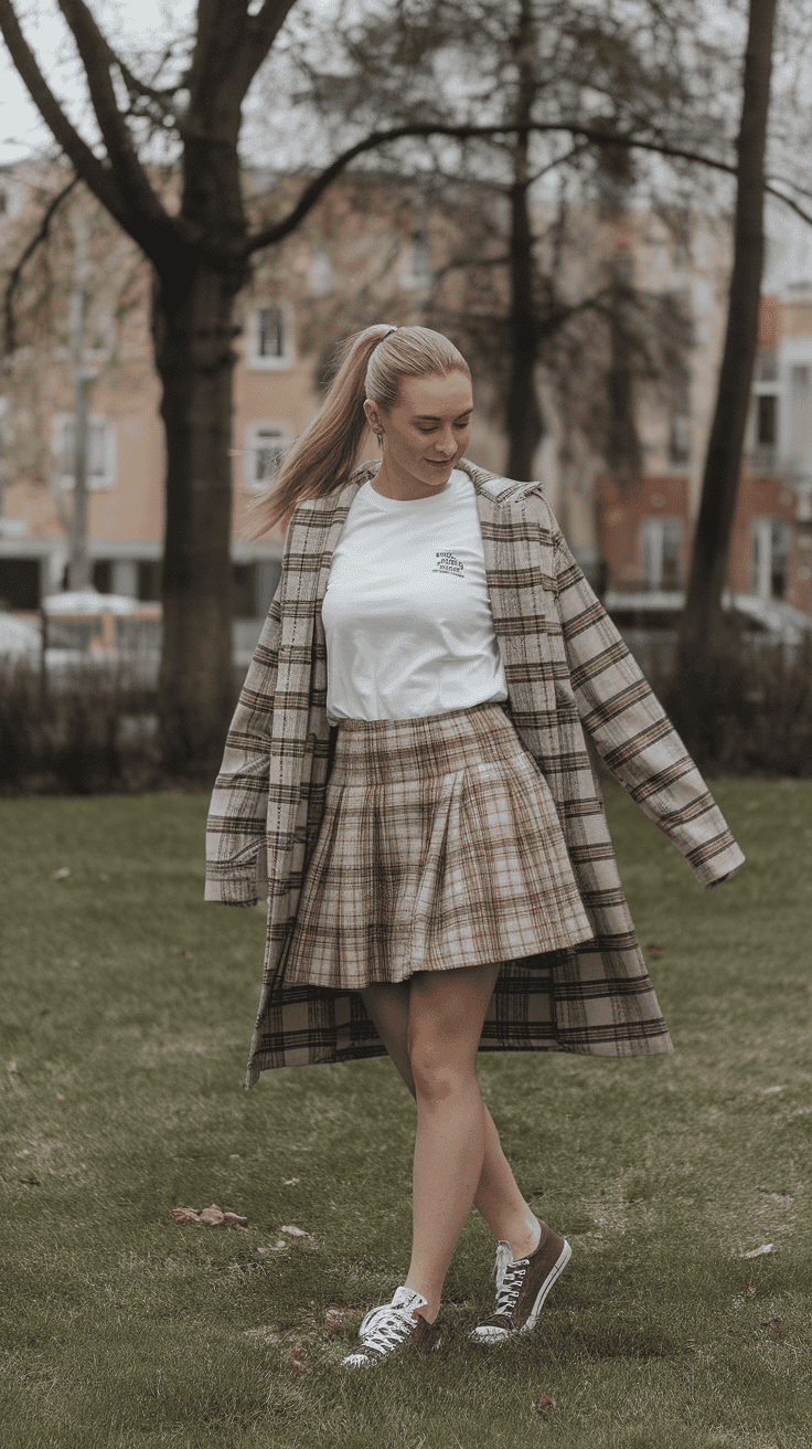 A basic white tee and plaid skirt make an easy, classic combo. It’s great for bowling dates or family outings—no need to overthink it.