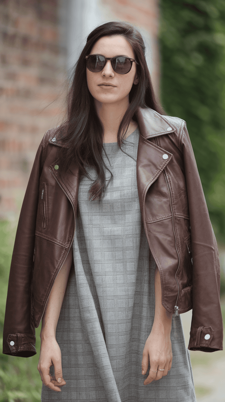 Layer a leather jacket over a simple shift dress for a cool, not-too-dressy look. It adds a bit of edge without going overboard.