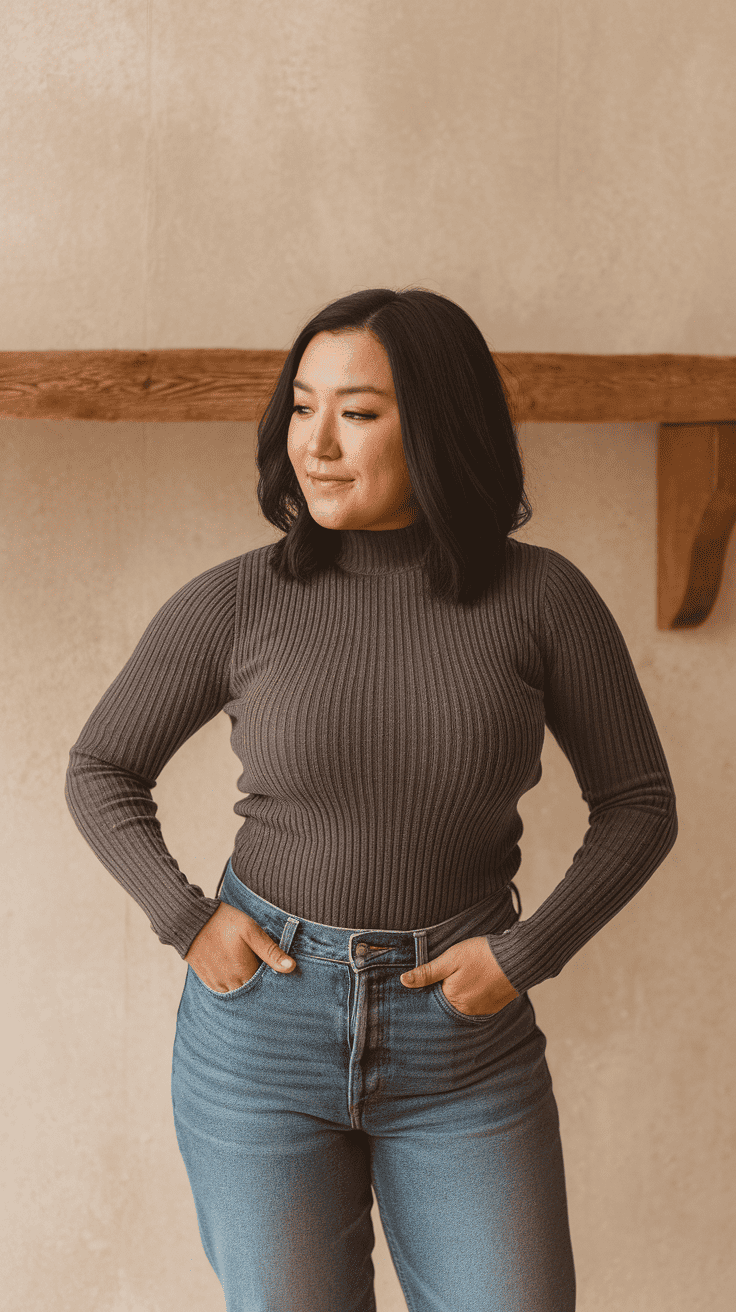 A ribbed mock neck sweater with straight leg jeans gives you a cozy but not bulky look for bowling. The jeans keep things casual and let you move.