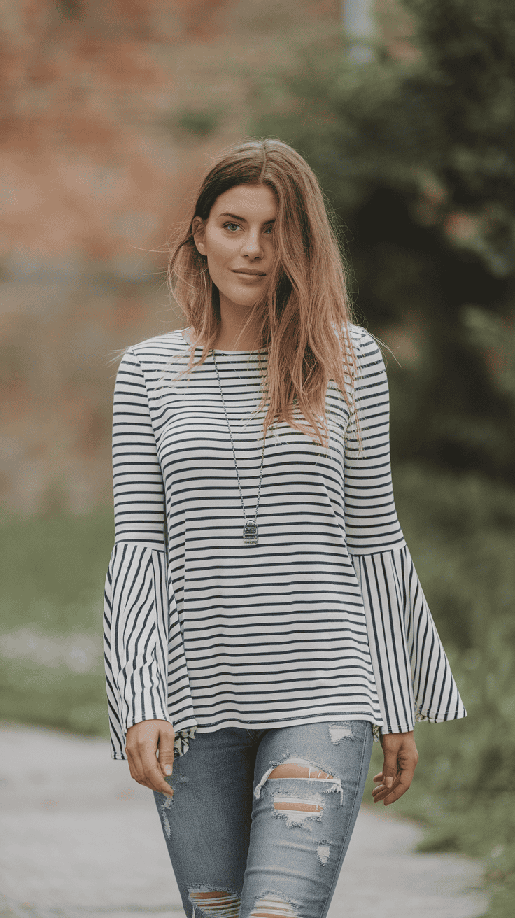 Pair a striped bell sleeve top with ripped skinny jeans for a fun, casual look. The stripes add style, and the bell sleeves bring a retro twist.