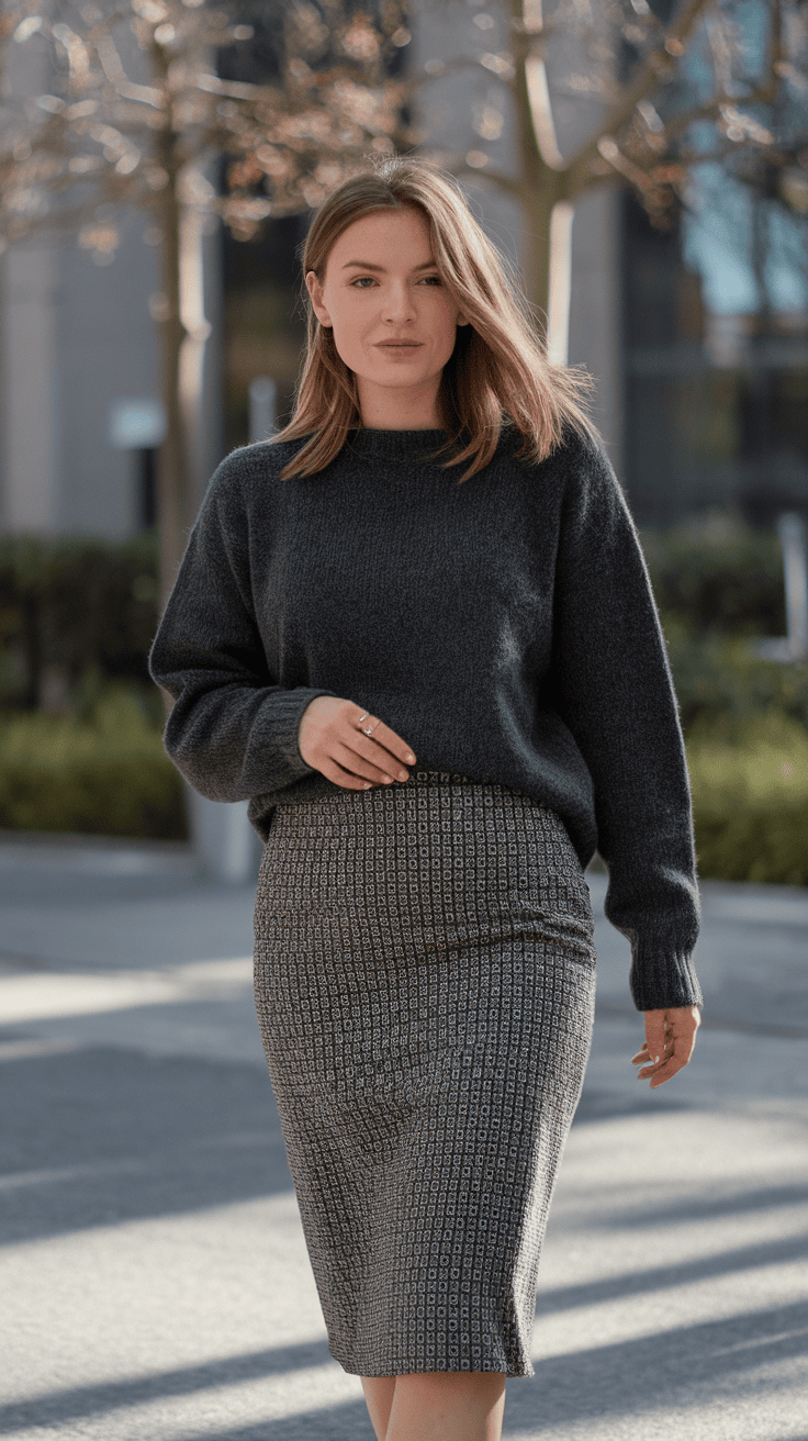 Pair a charcoal knit sweater with a patterned pencil skirt for a smart look. The dark sweater lets the skirt do the talking.