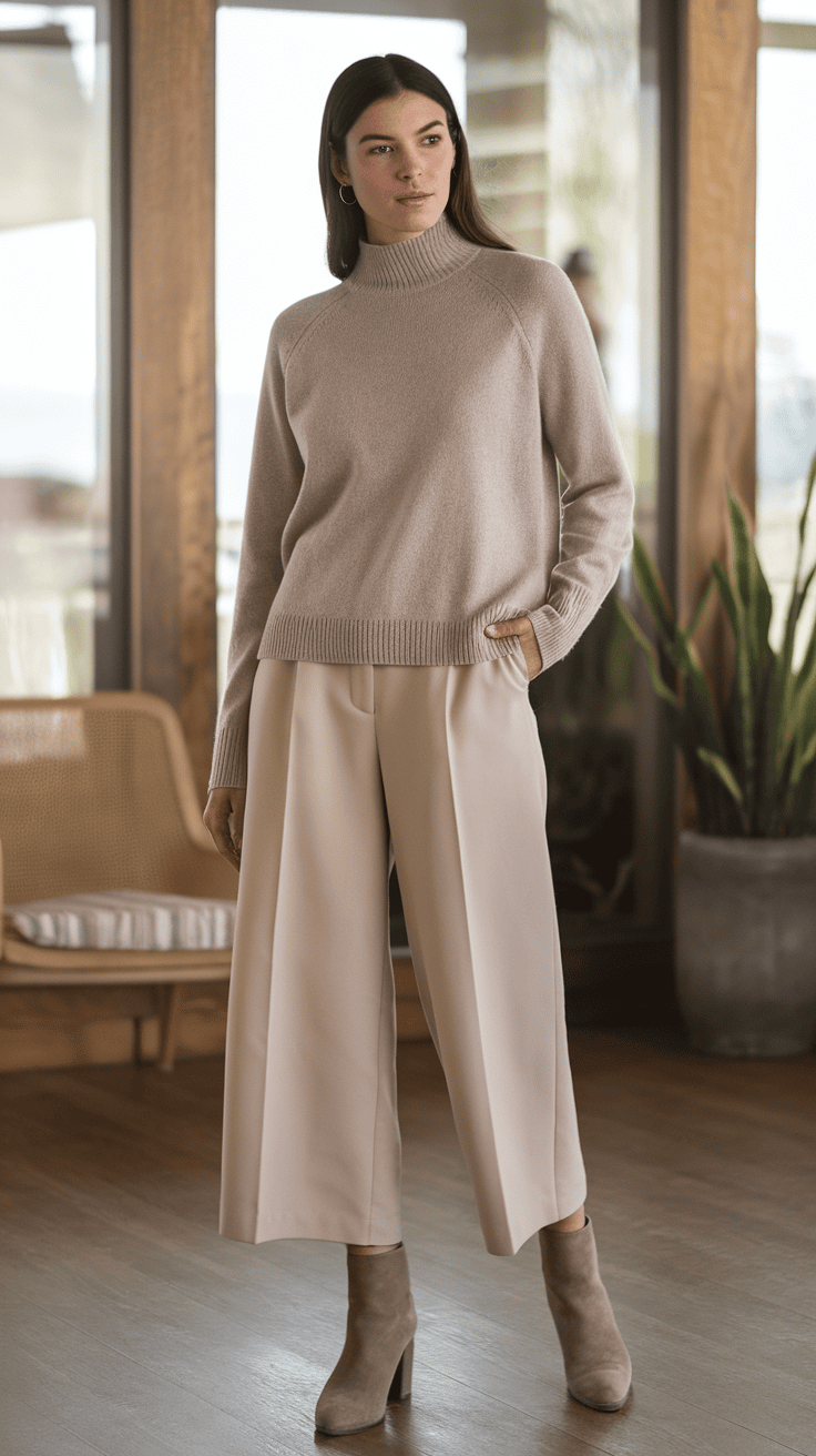A neutral cashmere sweater always feels soft and looks polished. Tailored culottes give it a modern edge.
